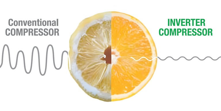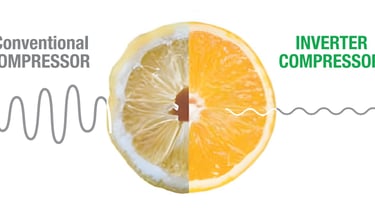 Compressor and fan inverter, speed in response to cooling demand. It uses less energy, minimizes noise and makes temperature stable.